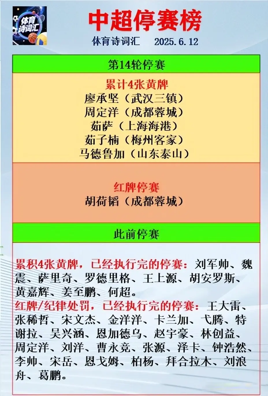 从春末到初夏,时隔差不多一个月,中超联赛即将再次与球迷见面,明天开始,中超第14轮将陆续展开对决,上轮因获得红牌或者累计4张黄牌的球员,本轮需要停赛。